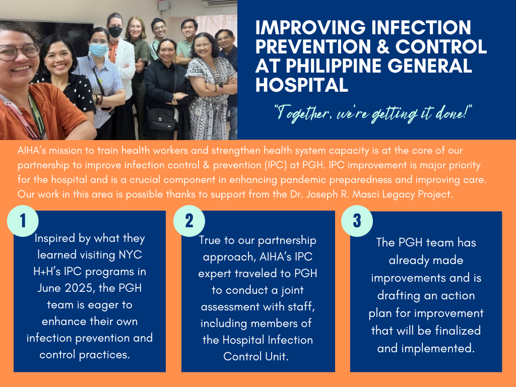 In June 2025, AIHA conducted a learning exchange that brought a team of five medical professionals from Philippine General Hospital (PGH) to NYC Health + Hospitals at Elmhurst, Bellevue, and Kings County through the project. The exchange focused on sharing best practices in HIV and infectious diseases and emergency and pandemic preparedness (EPP).