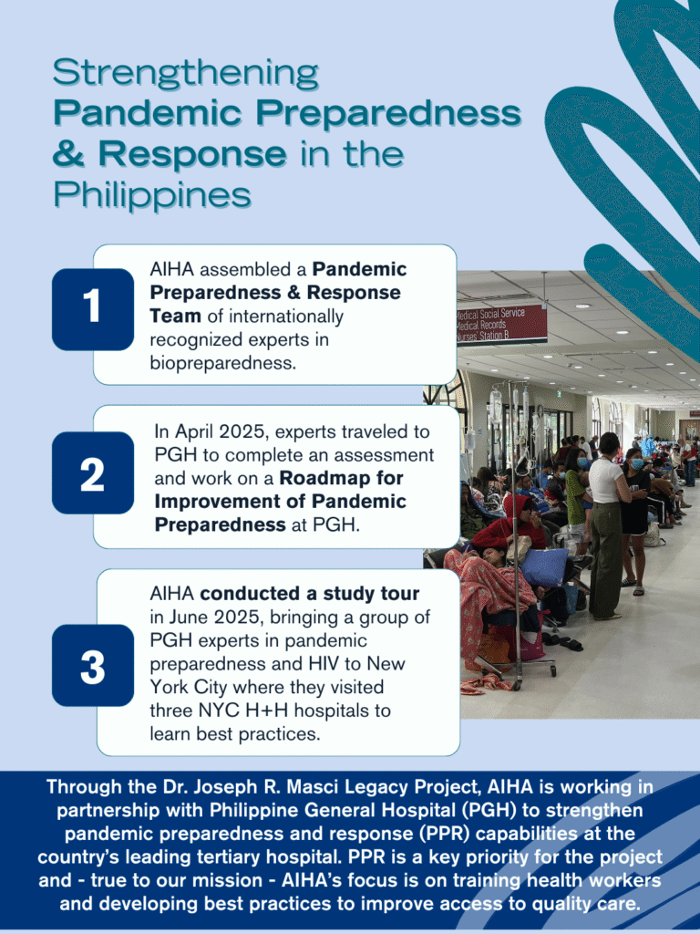 In June 2025, AIHA conducted a learning exchange that brought a team of five medical professionals from Philippine General Hospital (PGH) to NYC Health + Hospitals at Elmhurst, Bellevue, and Kings County through the project. The exchange focused on sharing best practices in HIV and infectious diseases and emergency and pandemic preparedness (EPP).